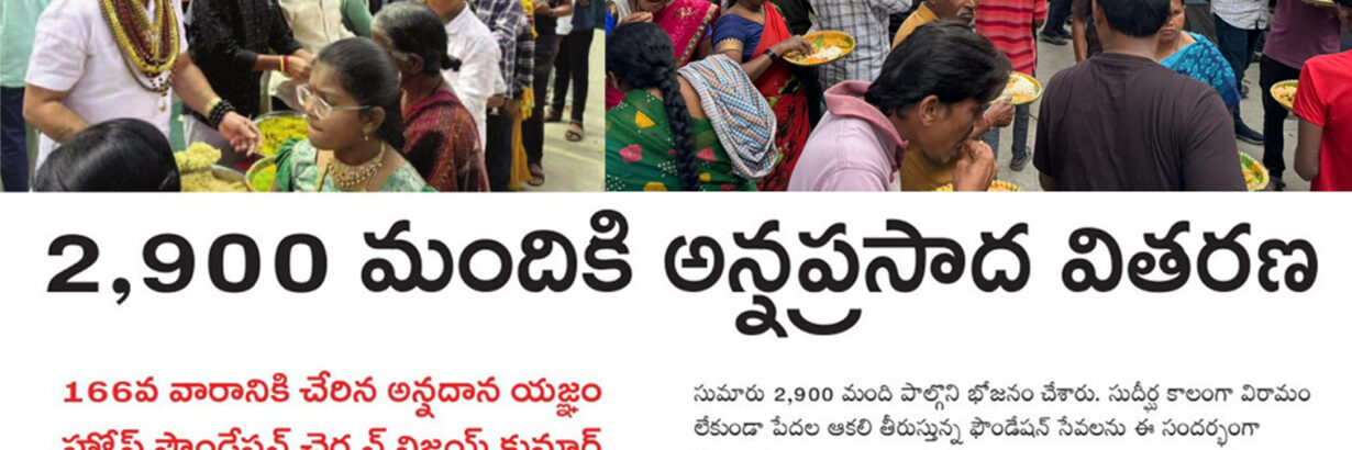 ప్రతి శనివారం అన్నదాన కార్యక్రమంలో భాగంగా హోప్ ఫౌండేషన్ ఆధ్వర్యంలో హుడా కాలనీ లోని హోప్ ఫౌండేషన్ కార్యాలయం వద్ద 166 వ శనివారం అన్నప్రసాద పంపిణీ కార్యక్రమం జరిగింది.