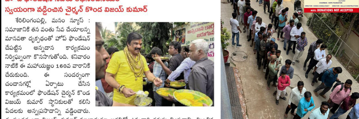 160 వ శనివారం…కలియుగ దైవం వేంకటేశ్వరుని ఆశీస్సులతో ప్రతి శనివారం అన్నప్రసాద పంపిణీ కార్యక్రమం… November 29, 2025Social ResponsibilitykondVinay ప్రతి శనివారం అన్నదాన కార్యక్రమంలో భాగంగా హోప్ ఫౌండేషన్ ఆధ్వర్యంలో హుడా కాలనీ లోని హోప్ ఫౌండేషన్ కార్యాలయం వద్ద 160 వ శనివారం అన్నప్రసాద పంపిణీ కార్యక్రమం జరిగింది. What is your opinion? Click here to cancel reply. Name E-Mail Website Comment Submit Comment ← చిన్న నాటి స్నేహితుడు, క్లాస్ మేట్ రంగారెడ్డి జిల్లా గ్రంథాలయ చైర్మెన్ ఏలుగంటి మధుసూధన్ రెడ్డి ( AMR) కార్యాలయంలో కలవడం జరిగింది. 161 వ శనివారం…కలియుగ దైవం వేంకటేశ్వరుని ఆశీస్సులతో ప్రతి శనివారం అన్నప్రసాద పంపిణీ కార్యక్రమం… →